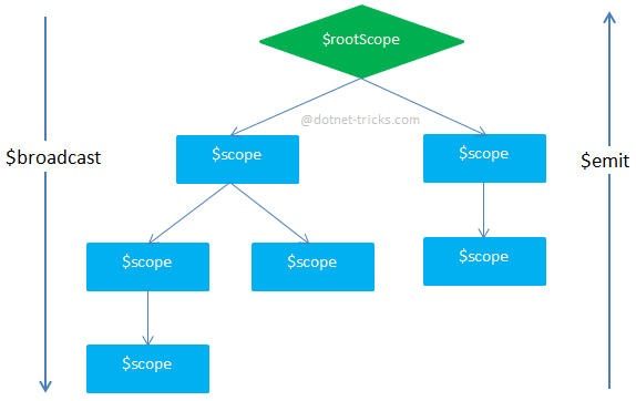 It dispatches an event name downwards to all child scopes (and their children) and notify to the registered $rootScope.Scope listeners. The event life cycle starts at the scope on which $broadcast was called. All listeners for the event on this scope get notified. Afterwards, the event traverses downwards toward the child scopes and calls all registered listeners along the way. The event cannot be canceled.