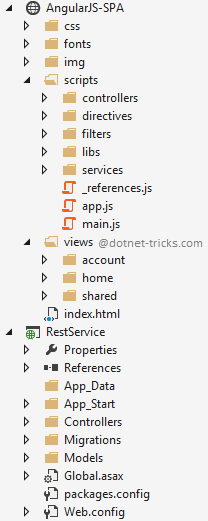 There are so many ways to organize your code files in SPA. Here, I have created the folder structure based on file types. This structure also help me to take the advantage of Visual Studio intellisense. To enable JavaScript code intellisense just add _references.js file into script folder as shown in given folder structure.