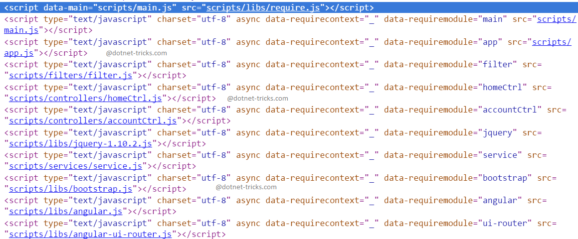 Here, I have added a reference to require.js file and others js files will be loaded by requirejs asynchronously by using data-main attribute scripts/main.js file. The main.js file is used to define your application JavaScript modules and files dependencies.