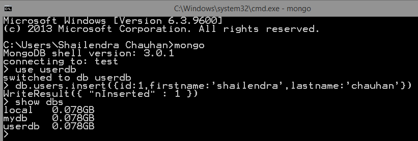 Now, run show dbs command to see the list of created databases. Refer above fig.